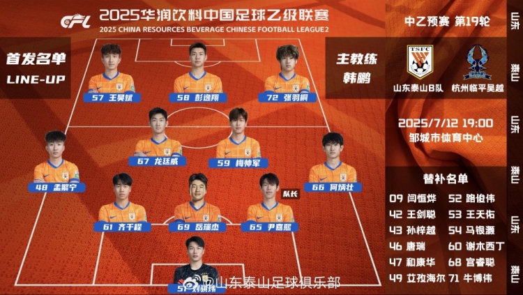 中乙山东泰山B队主场与杭州临平吴越队首发阵容,加油